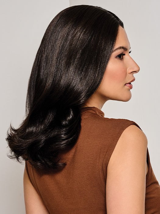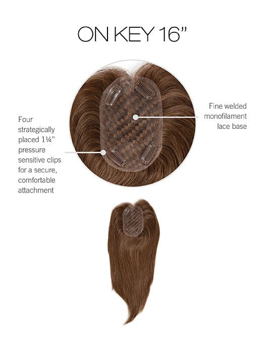 On Key by Raquel Welch is part of the Transformations Collection. This lightweight clip-in topper is a work of art made with 100% human hair. The base is a single piece of fine-welded monofilament lace to help this topper lie flat on the head to minimize bulk. bumps. and ridges.