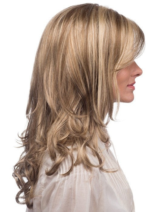 Abigail by Estetica is a long. layered. and softly curled synthetic wig. Style it off-the-face or pulled back with the temple to temple lace front. The lace extends down creating a natural monofilament part. Even up close. the look is completely natural. The face-framing bang and layers cut around the face flatter all women.