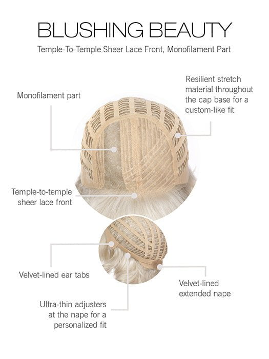 Blushing Beauty by Eva Gabor is soft and sophisticated. Its salon-inspired barrel curls flatter any face frame giving the wearer a stylish. put-together look! This low-density wig offers a feathery and light feel perfect for new wig wearers. To style this lace front wig. mist with spray enhances the texture or brush through for a fuller. sophisticated look. The lace front hairline runs from ear to ear. and the monofilament extends to the crown. giving this wig a natural-looking part line with the ability to style hair off the face or don a sweeping bang.