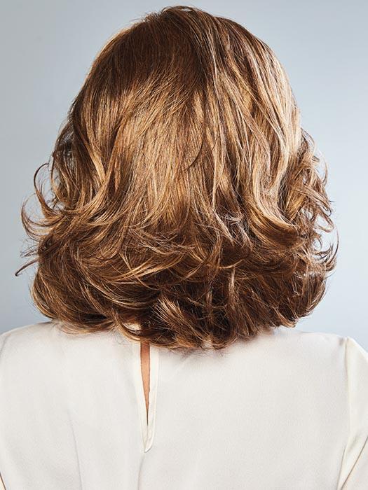 Bouncy Beauty by Gabor is a voluminous style that sits just above-the-shoulders and includes barrel waved layers for soft. gentle fullness throughout. The deep monofilament part provides natural density on top while the all-over layering allows for added styling versatility.