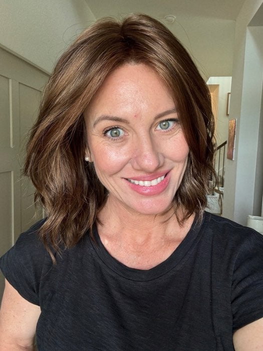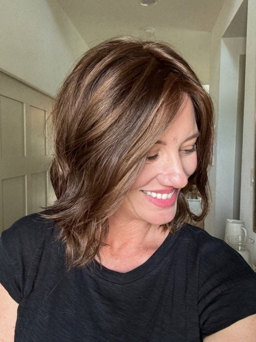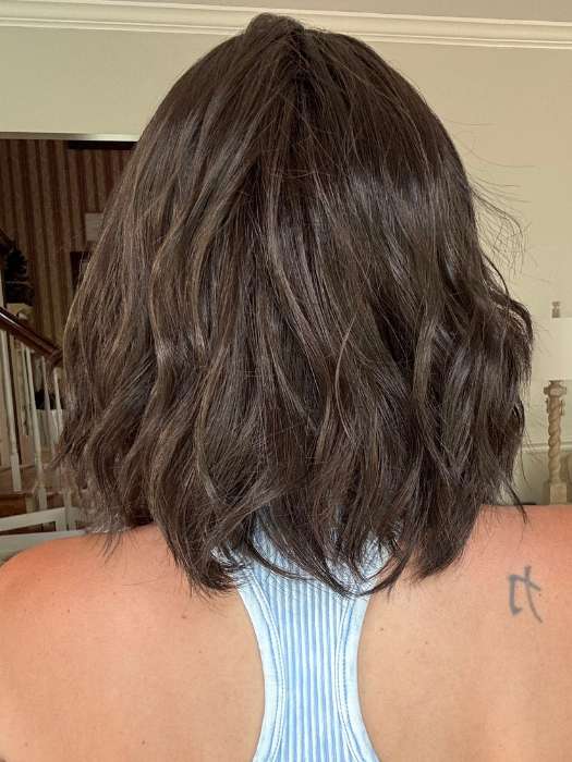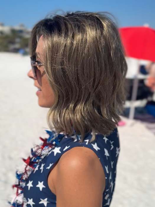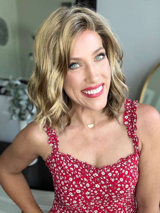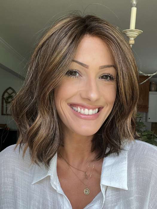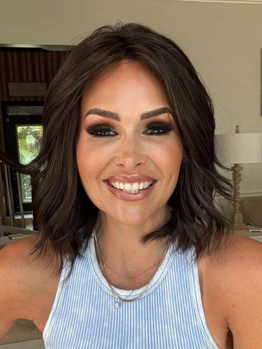 Charlotte by Envy showcases a wavy. layered bob that extends past the chin for a mid-length hairdo. The synthetic wig has a monofilament part that creates the look of hair growth. The lace front gives the illusion of natural hairline.