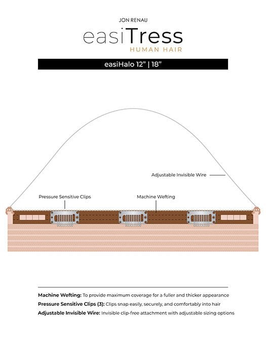 The easiHalo 18" human hair extension by Jon Renau is easy to apply and remove for quick and easy wear. This handmade halo extension has an adjustable invisible wire that disappears into your hair for a discreet and secure fit. This style features gradual layers of high quality 100% Chinese Human Hair that blends into your biological hair for an instantaneous voluminous look. Also available in 12" and 22" lengths.