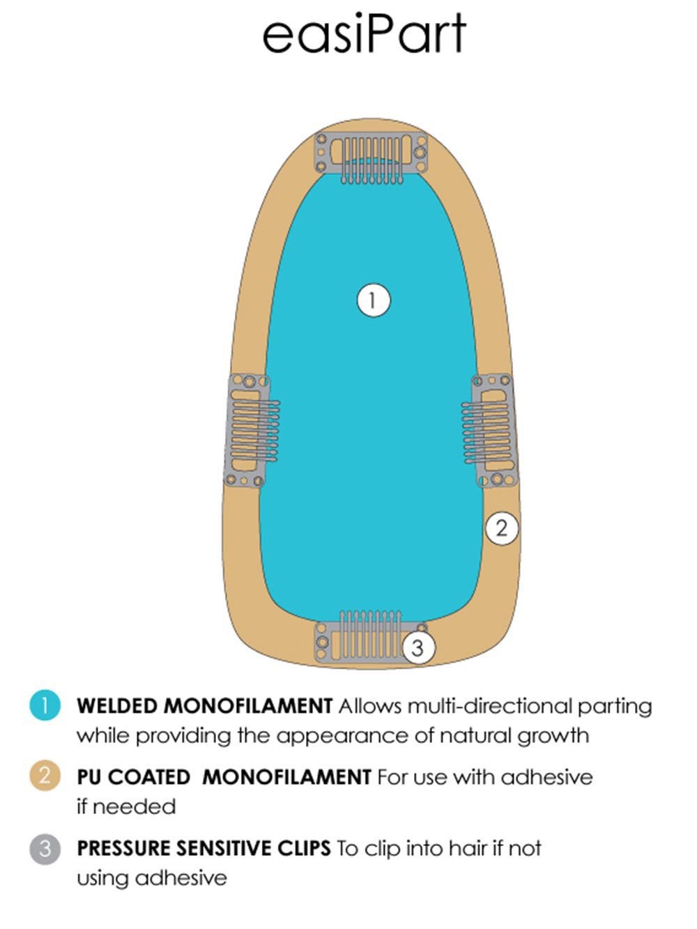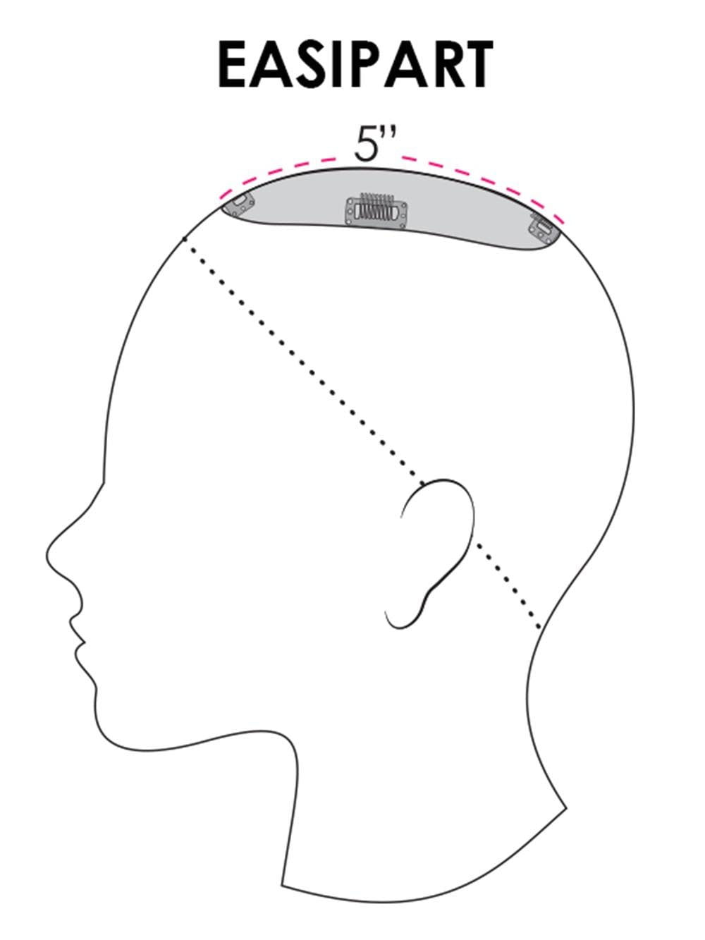 This easiPart HD 8” by easihair is a one-piece volumizer. available in lengths of 8. 12 and 18 inches. adds instant thickness and body. clipping in quickly for all-day comfort. The base size is 2.75”x5” and is ideal for adding volume. covering thinning at the part. or concealing new growth between colors. It attaches with 4 pressure sensitive clips and is available in a variety of colors. The HD synthetic fiber looks and feels like real hair and can be styled with heat tools.
