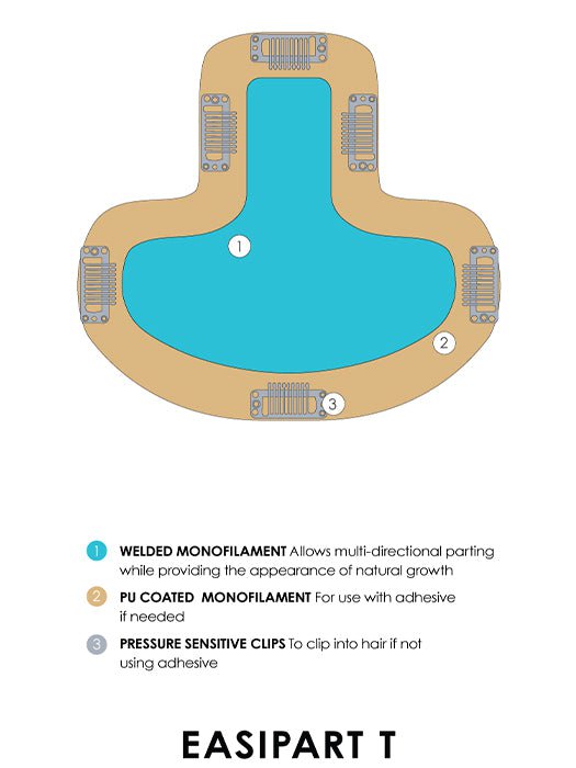 Meet easiPart T by Jon Renau. the perfect friend for your crown's needs. If you're battling thinning hair. this one's for you. With its high-density design and broad base. this topper has got you covered. The large polyurethane perimeter comes with five thoughtfully positioned pressure-sensitive clips for secure placement. Prefer Tape 'N Go or adhesive? The clips can be effortlessly removed to suit your preference. easiPart T is also available in an 18-inch length.