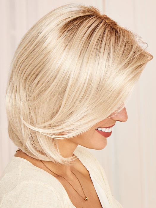 Flatter Me by Gabor is a long bob with free-flowing layers. With a temple-to-temple lace front and hand-tied top. this synthetic wig looks flawlessly natural. Wear the face-framing. feathered bang swept down or off the face to customize your style.
