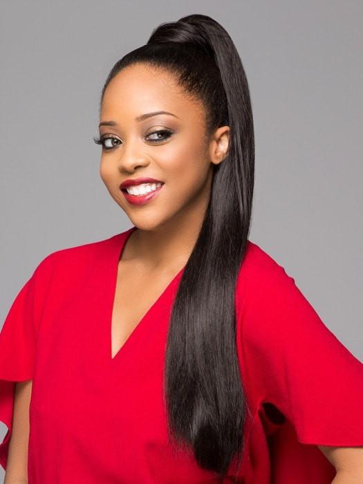 Pocket Bun Rose is a 28" long and layered pony with Yaki textured. straight hair. The high heat resistant fiber not only curls well but also keeps the curl and style longer. The length and fiber allow you to style the hair in different ways to create different looks. The Yaki texture is subtle but looks and feels like your own naturally curly hair after it has been straightened.