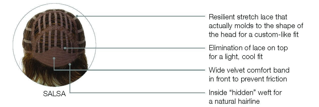 Salsa Large by Raquel Welch is a collar length. layered page that can be styled full or smooth - depending on your mood. It's a wavy style with a wispy bang and built-in volume that gives you nice lift at the root. The layering around the face is very flattering. and the capless construction makes it lightweight. cool and comfortable. Salsa Large is a versatile style you can make your own and is also available in an average cap size. Also available in gray colors. beautiful shades of grey!